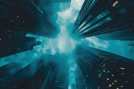Dramatic view of blue skyscrapers with glass facades towering above urban cityscape elements