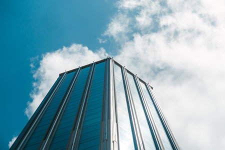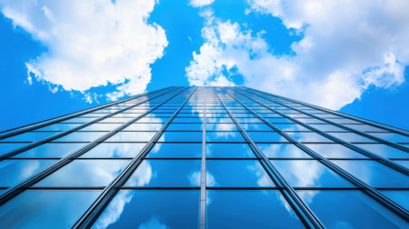Low angle view of a modern glass skyscraper reflecting the blue sky and white clouds, conveying growth, success, and corporate power. Generative ai