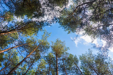 Tall old coniferous trees in the forest, bottom view. Selective focus, blue sky background.