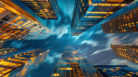 Low-angle view of modern skyscrapers in a city, showcasing urban architecture and cityscapes at dusk or dawn