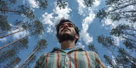 Young man enjoying a peaceful moment under tall trees, embracing nature s beauty and tranquility.