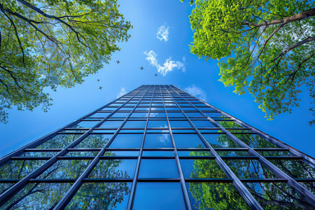 A modern glass building reflecting clear blue sky symbolizes innovation and renewable energy efficiency in urban architecture