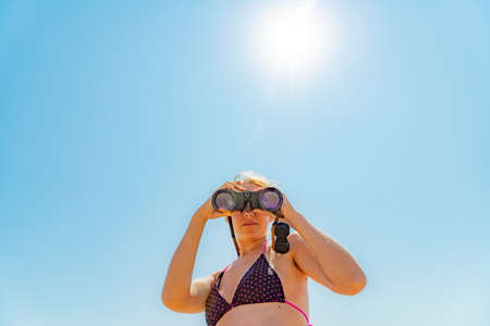 A girl in a swimsuit looks through binoculars at the camera on a background of elephant sky.