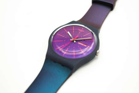 Paris, France 07.10.2020 - Swatch swiss made quartz watch isolated on white background. colored plastic case Fluorescent colors youth hipster style watch for bright image. Swatch Group