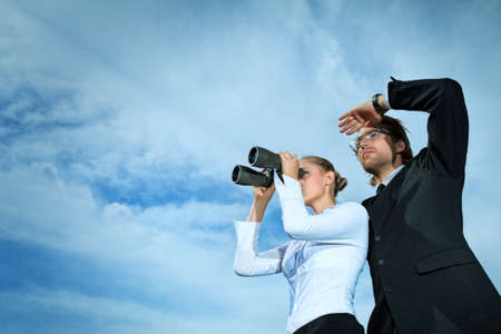 Successful business people standing over blue sky and purposefully looking away.