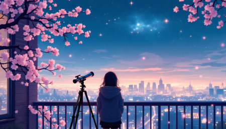A girl gazes at a beautiful cityscape at night under a starry sky with cherry blossoms Perfect for anime or fantasy themed projects.