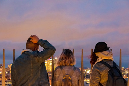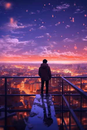 Man looking at the city at twilight time. Colorful realistic illustration. Generative AI art