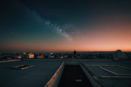 Two people sit on a rooftop, gazing at the starry night sky over a cityscape, capturing a peaceful moment of wonder.