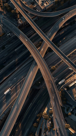 Generative AI Overhead views of a bustling freeway interchange connecting major highways and roads, capturing traffic flow.