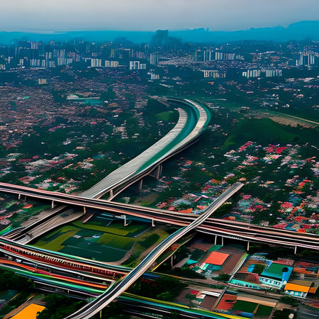 An aerial view of a sprawling metropolis, with a network of elevated railway tracks crisscrossing the cityscape, highlighting the interconnectedness of urban transit systems.