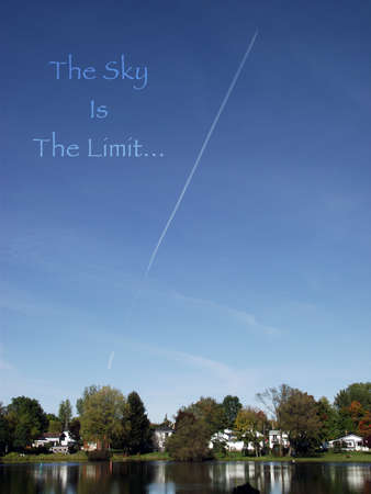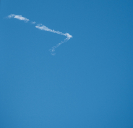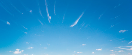 Aircraft condensation contrails in the blue sky inbetween some clouds