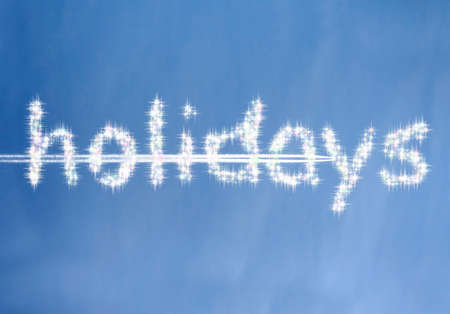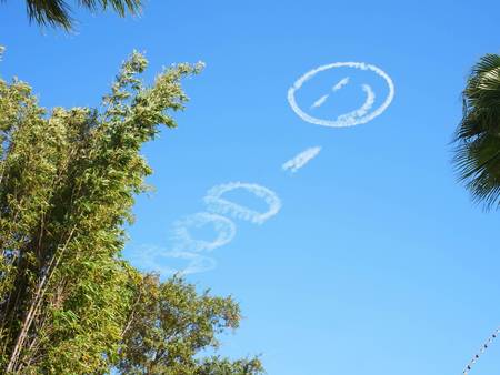 Sky writing Jesus with a happy face on blue sky and sun bursting rays