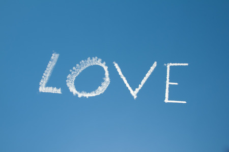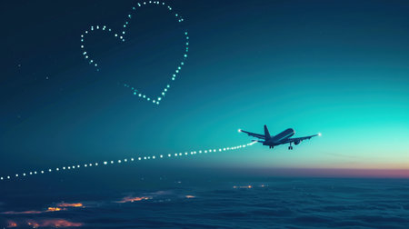Aircraft draw a heart in the sky. Flight route of aircraft in shape of a heart. Love concept for traveling the world. Copy space for text