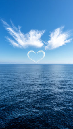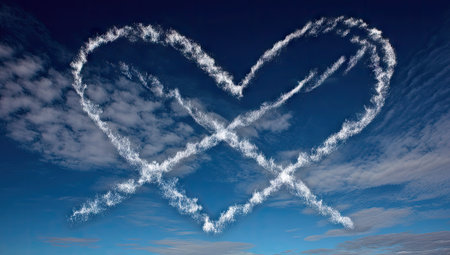 A stunning heart-shaped cloud formation made by aircraft contrails creates a romantic atmosphere in a clear blue sky, inviting feelings of love and connection.