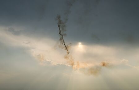Aerobatic team group of fighters jet flies in the sky with brightly colored smoke under the setting sun in the evening sky.