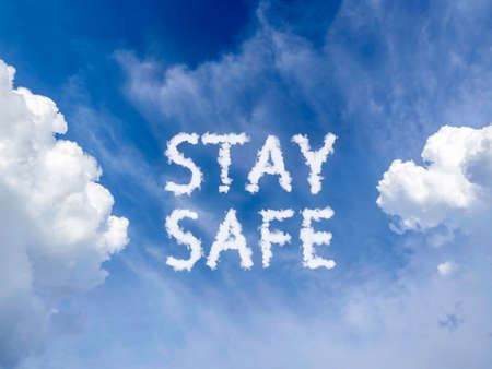 Stay safe concept. Blue sky background with white fluffy cloud message Stay Safe. Poster, banner for social media campaign for covid-19 or coronavirus pandemic prevention.