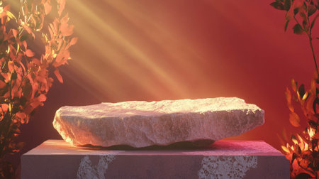 Atmospheric abstract design with raw stone podium and sunlit foliage