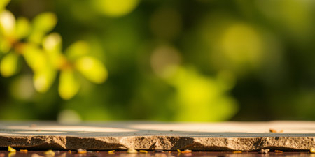Close Up of a Stone Countertop with Blurred Farm Garden Background Natural Sunlit Bokeh. High quality photo