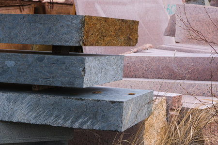Piles of granite marble slabs. Stone sheets for decorative construction.