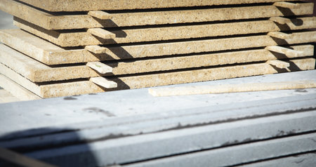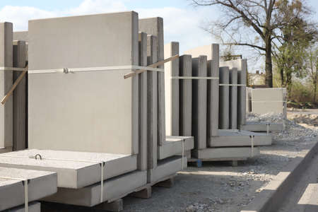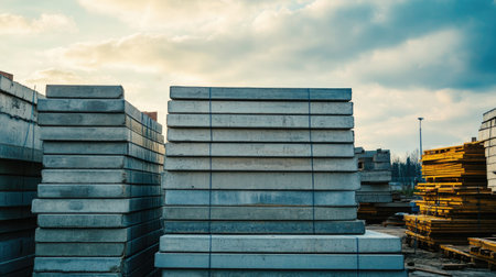 Stacks of concrete slabs at a building site, blank sky above for copy