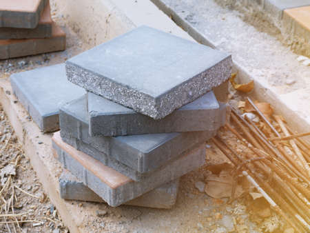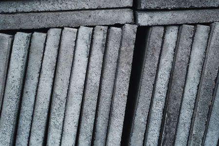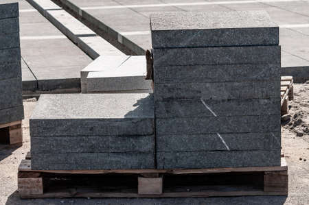 gray curbs and new construction tiles for laying paths and building roads, for repairing and building Parking lots in a new area of the city, road tiles are made of concrete and have a gray color