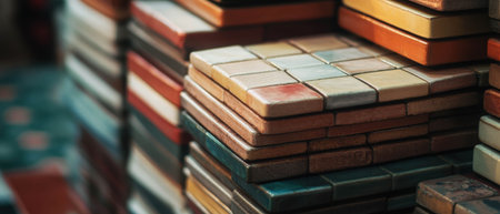 Stacks of ceramic tiles showcasing vivid colors and intricate details in soft lighting