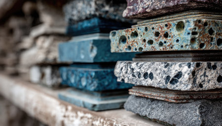 Assortment of stone types in a construction setting, featuring raw granite, limestone, and sandstone blocks ready for use.. AI generated.