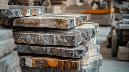 A stack of polished stone slabs in a workshop, ready to be cut and shaped for countertops