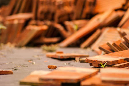 Large concrete slabs stacked on top of each other with construction debris surrounding them
