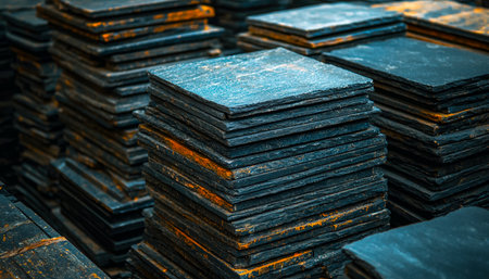 Weathered slate pieces with rusted patina are carefully stacked, showcasing textured surfaces and earthy tones in a clean, organized display.