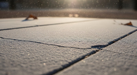 A low-angle close-up view of pavement pavers covered in a thin layer of morning frost and snow crystals. Sunlight backlights the scene, creating a glistening effect on the icy texture and highlighting a few scattered dry autumn leaves.