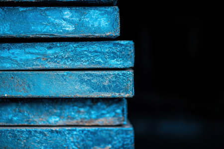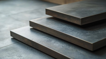 This image showcases a striking arrangement of metallic and textured blocks, beautifully reflecting light and casting shadows in a contemporary industrial setting.