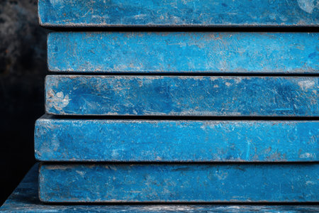 Different layers of textured surfaces are stacked together, highlighting shades of blue, gray, and rusty tones in a contrasting arrangement.