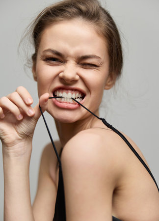 Joyful young woman playfully biting a strap, showcasing confidence and mischief. Light gray background enhances her fun and expressive emotions.