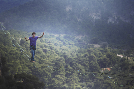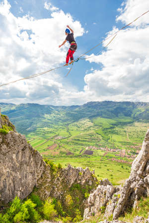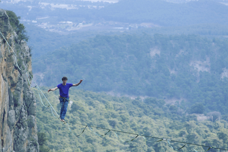 Highliner on a rope. Highline on a background of mountains. Extreme sport on the nature. Balancing on the sling. Equilibrium at altitude.
