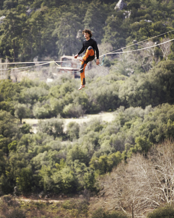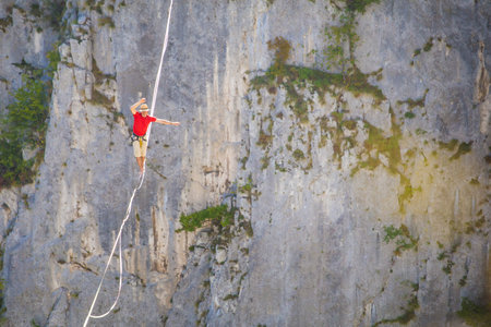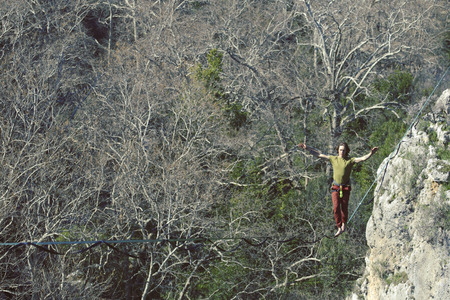 TAVERTET - APRIL 13: Man practicing highline in Tavertet, Spain on April 13, 2013. Highline is a balance sport that consists walking through a rope clamped between two points and great height below.