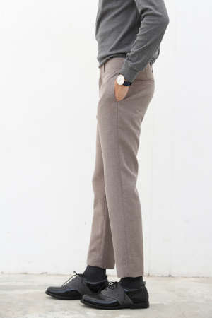 close-up of handsome man in gray turtleneck shirt and long trousers on white background.