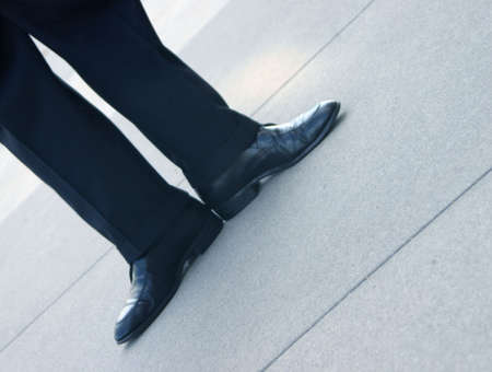 Business man has his feet pointed out in opposite directions on the concrete floor