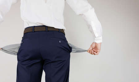 A man in a business suit turned his pockets inside out. Financial crisis. Bankruptcy in business. An entrepreneur without money.