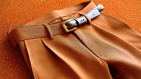 Explore a fashionable display of orange trousers featuring a stylish belt, set against a textured background, perfect for fashion-focused projects and visual storytelling.