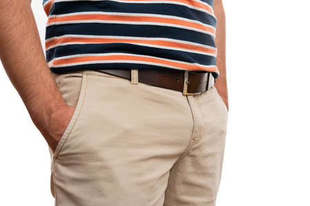 Close-up of adult male model holding hands in brown beige trousers or pants pockets wearing casual summer striped tshirt isolated on white studio background