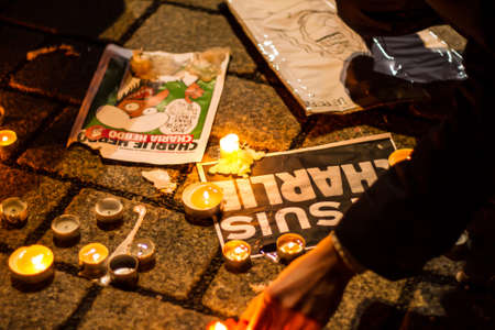 BERLIN, GERMANY - JANUARY 7TH, 2015: March against Charlie Hebdo magazine terrorism attack, on January 7th, 2015, in front of France Embassy in Berlin, Germany