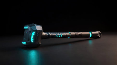 A detailed 3D render of a futuristic hammer with glowing blue accents, set against a dark background.