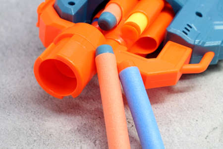 A table with a blue background and a blue plastic gun on it. There are several bottles of different colors and sizes on the table