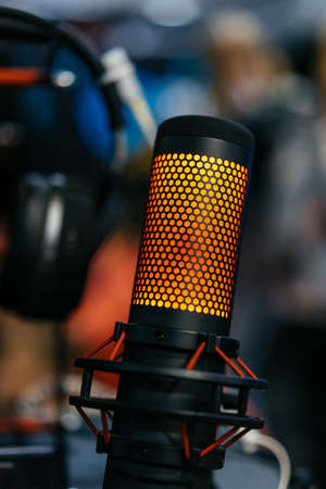 front view of black condenser microphone in music studio during recording. blurred background of rehearsal room. music industry concept.