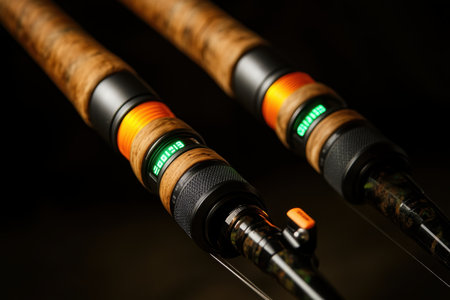 Two fishing rods with cork grip and illuminated components display readiness for an evening fishing trip.