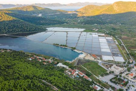 Aerial drone shot of Salt Pan in city of Ston in Croatia Summer sunrise