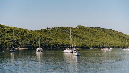 Many yachts moored off Dugi Otok island shore, idyllic coastal destination in Adriatic Sea, Croatia