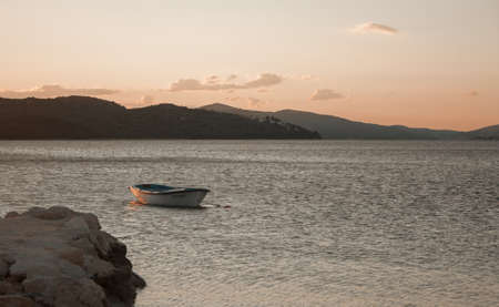 Beach by the sea at sunset with a lonely abandoned boat in the water. Mountains in the background. Travel Croatia. Summer landscape