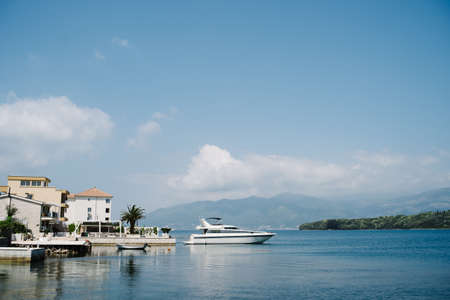 White cruise yacht at the pier by the cottage against the backdrop of the mountains.